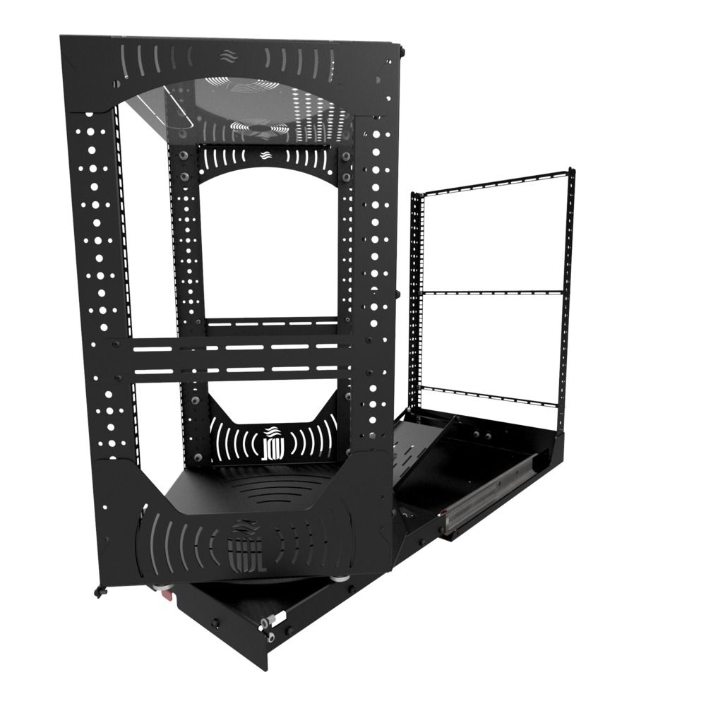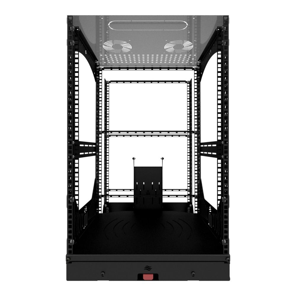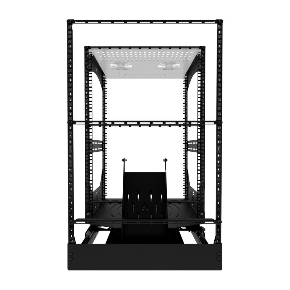 Die Rack-Basis lässt sich leicht herausziehen, einrasten und um 180° drehen, um bei der Installation oder Wartung einen schnellen Zugriff zu ermöglichen. Mit den mitgelieferten Kabelführungsplatten und L-Schienenprofilen ist die Organisation von Kabeln und Komponenten ein Kinderspiel. Optionale Lüfterhalterungen an der Oberseite sorgen für eine effiziente Kühlung.