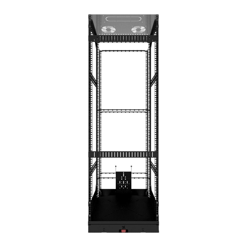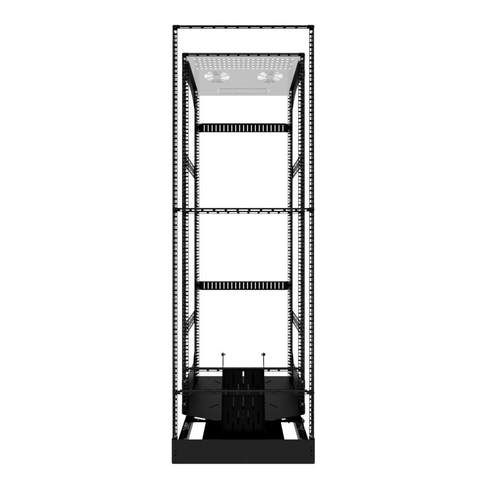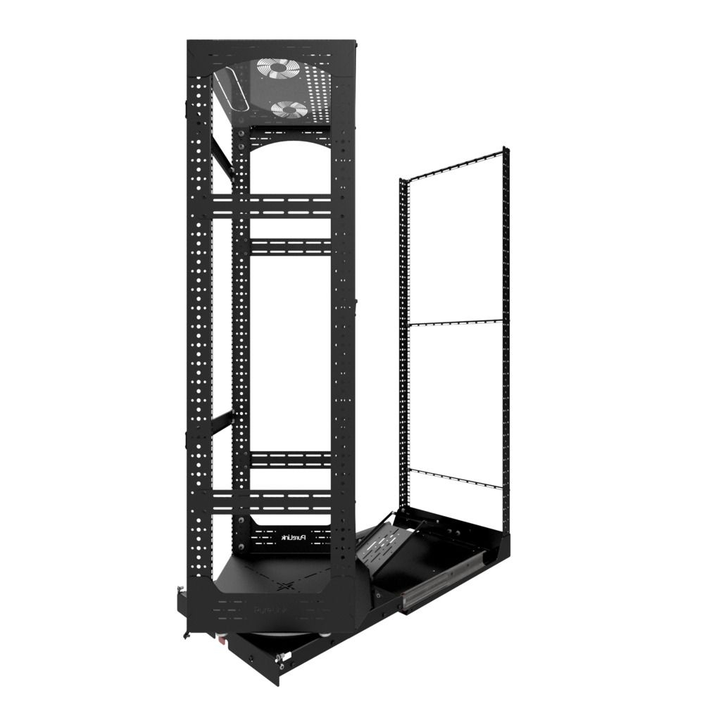 Die Rack-Basis lässt sich leicht herausziehen, einrasten und um 180° drehen, um bei der Installation oder Wartung einen schnellen Zugriff zu ermöglichen. Mit den mitgelieferten Kabelführungsplatten und L-Schienenprofilen ist die Organisation von Kabeln und Komponenten ein Kinderspiel. Optionale Lüfterhalterungen an der Oberseite sorgen für eine effiziente Kühlung.