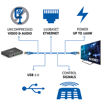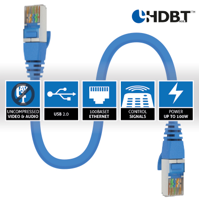 HDBaseT is the leading standard for the professional transmission of high-resolution multimedia via one single cable. The HDBaseT technology combines the transmission of audio, video, ethernet, power, control and USB signals over a single cable. HDBaseT provides a simple transfer solution based on the plug-and-play principle and can be accomplished with off-the-shelf power cables and plugs (RJ45, CAT 5, 6, 7).