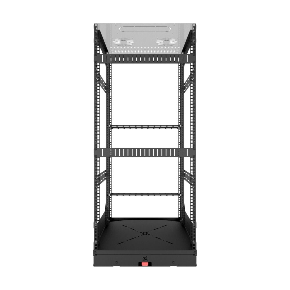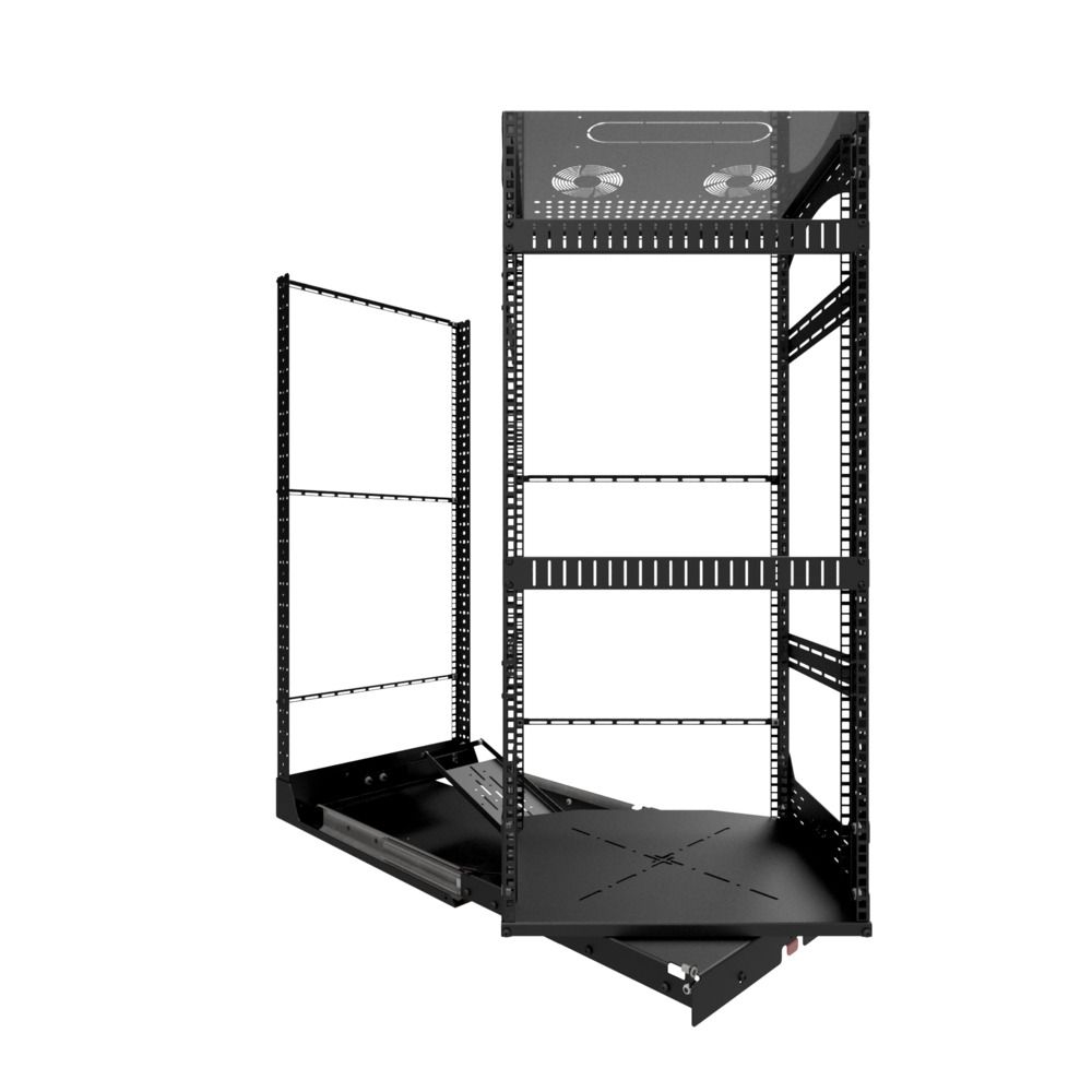 For easy access, simply slide the rack base out, lock it, and rotate it 180° – perfect for quick installation and maintenance. Included wire management plates and L-rail profiles keep your systems organised, while the optional fan installation points on the rack top help maintain proper cooling.