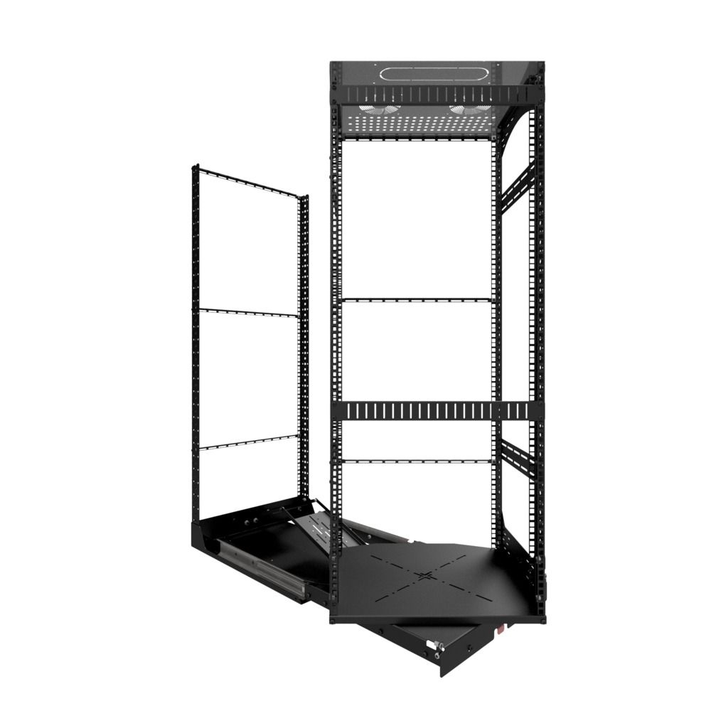 For easy access, simply slide the rack base out, lock it, and rotate it 180° – perfect for quick installation and maintenance. Included wire management plates and L-rail profiles keep your systems organised, while the optional fan installation points on the rack top help maintain proper cooling.