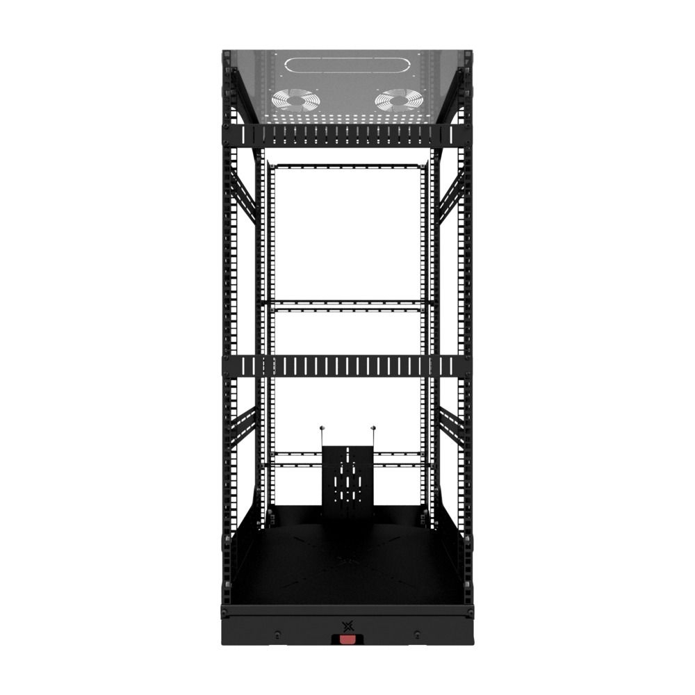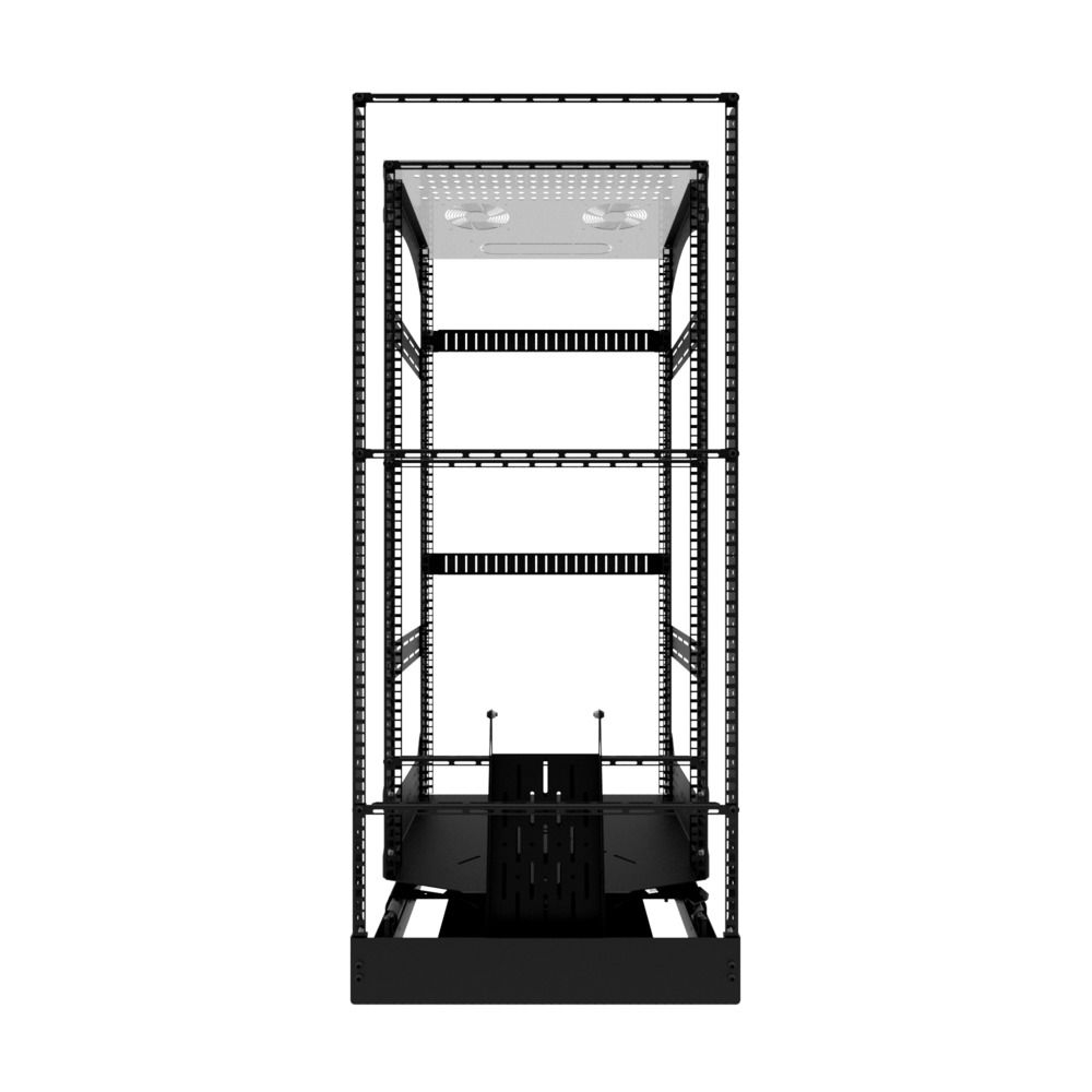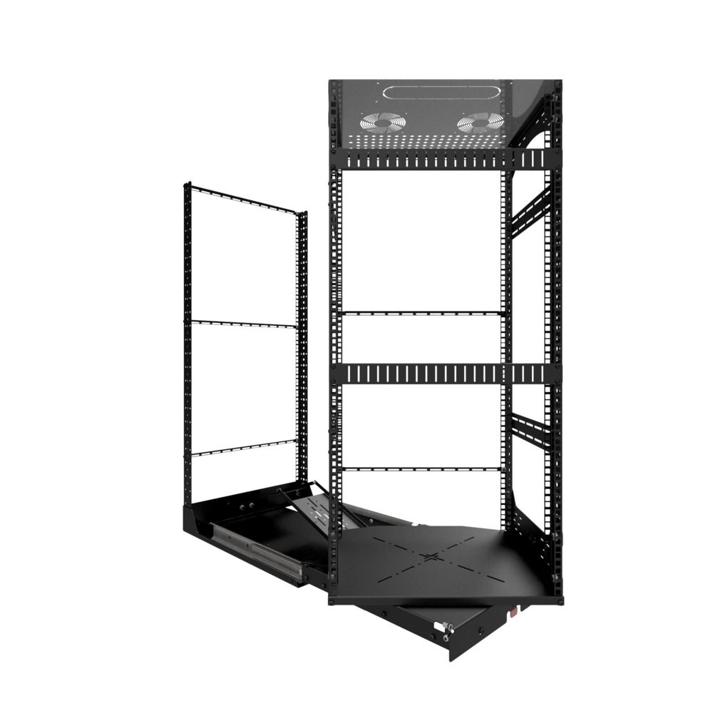 Designed for convenience, the rack base easily slides out, locks into place, and rotates 180° for quick access during installation or maintenance. With wire management plates and L-rail profiles included, organising cables and components is seamless. Optional fan mounts on the top panel provide efficient cooling options.